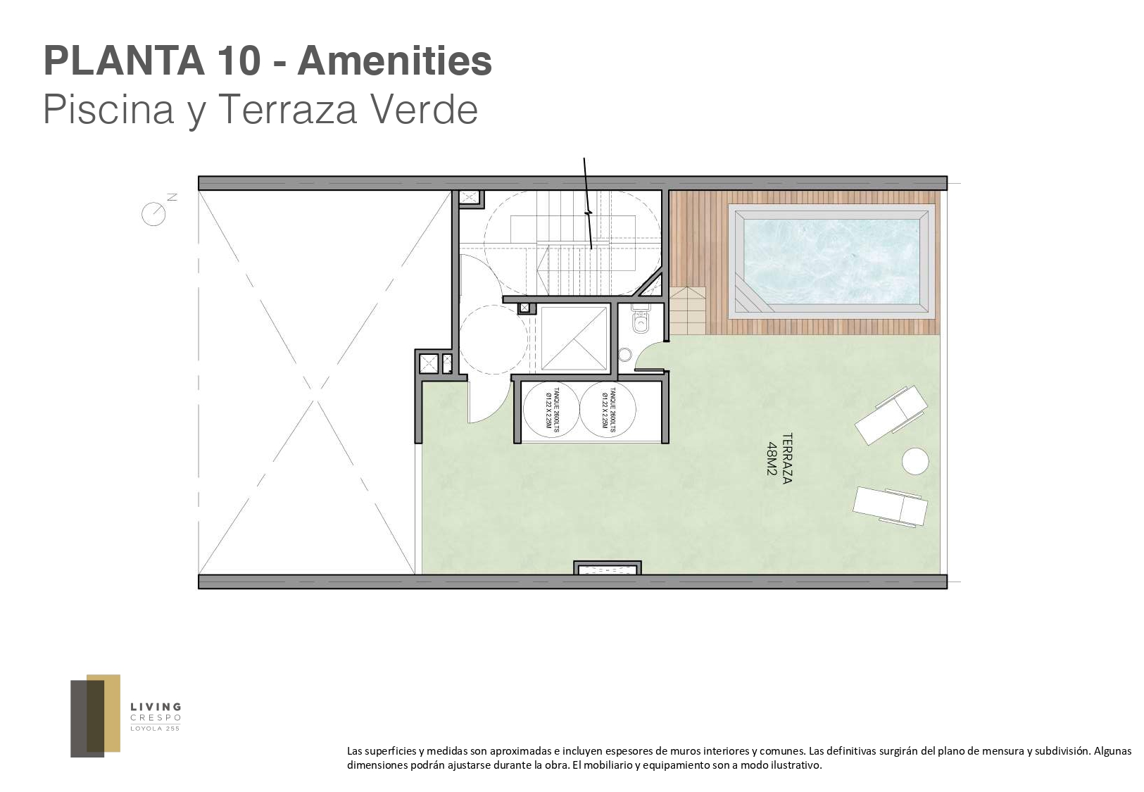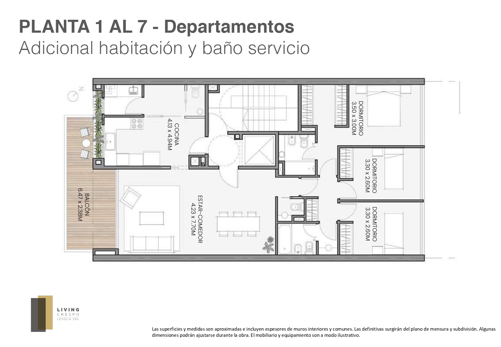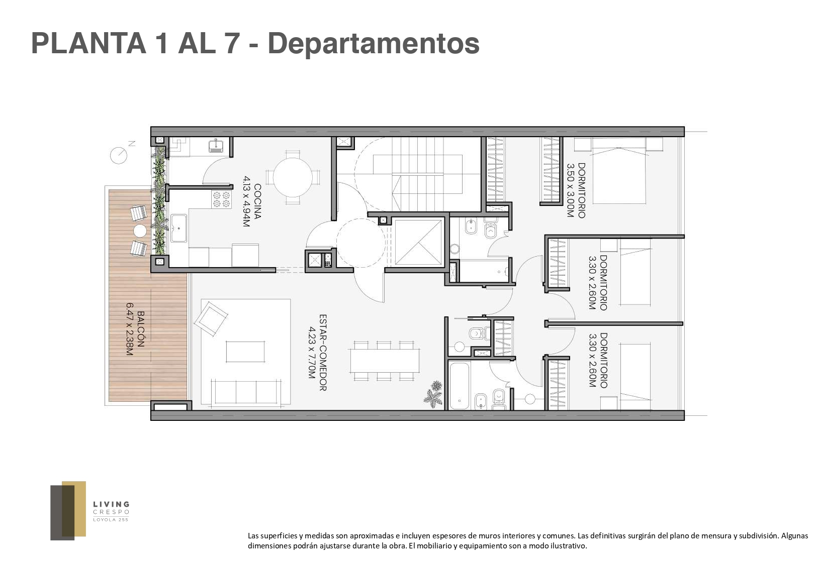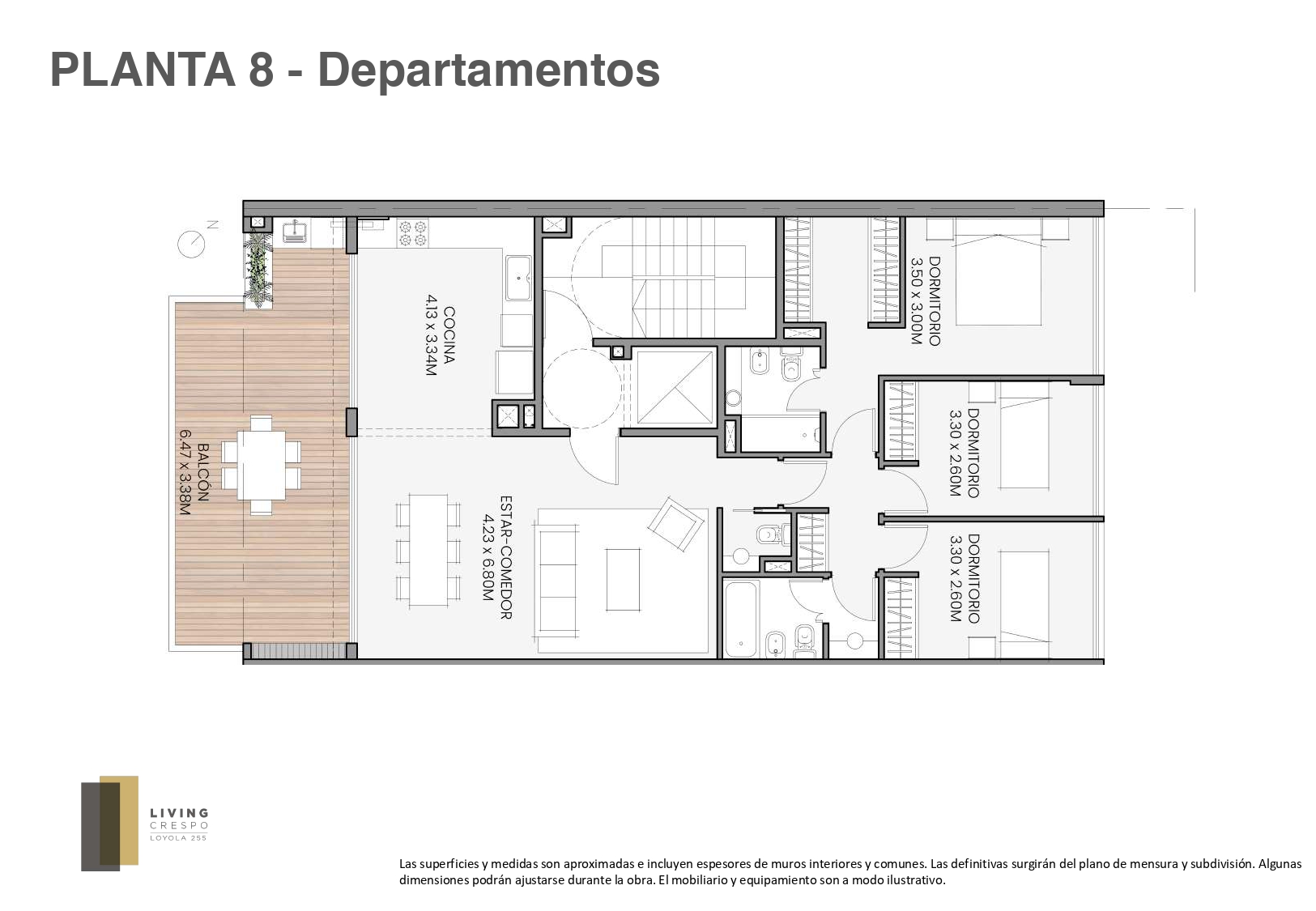 Las medidas y superficies provistas son estimadas, pueden sufrir variaciones, e incluyen hasta un 100% de los muros y plenos de instalaciones, considerándose definitivas las que resulten del plano de subdivisión en propiedad horizontal.